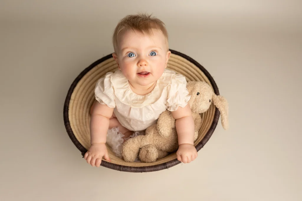 Your Little Sitters session takes place in our beautiful studio located in Kinoulton, Nottingham. We will collaborate to select the perfect color scheme and create stunning, personalised portraits of your baby.